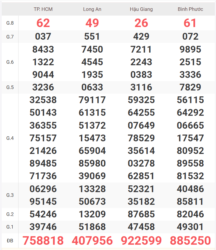 – Thứ 7 do 4 đài quay số là TP Hồ Chí Minh, Long An, Bình Phước, Hậu Giang phát hành.