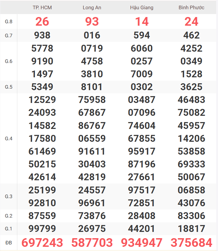 – Thứ 7 do 4 đài quay số là TP Hồ Chí Minh, Long An, Bình Phước, Hậu Giang phát hành.