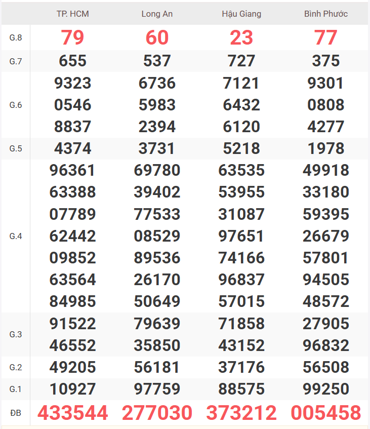 – Thứ 7 do 4 đài quay số là TP Hồ Chí Minh, Long An, Bình Phước, Hậu Giang phát hành.