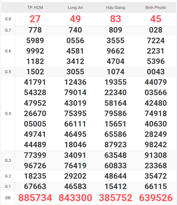 – Thứ 7 do 4 đài quay số là TP Hồ Chí Minh, Long An, Bình Phước, Hậu Giang phát hành.