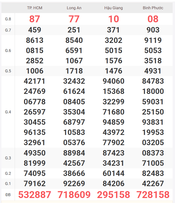 – Thứ 7 do 4 đài quay số là TP Hồ Chí Minh, Long An, Bình Phước, Hậu Giang phát hành.