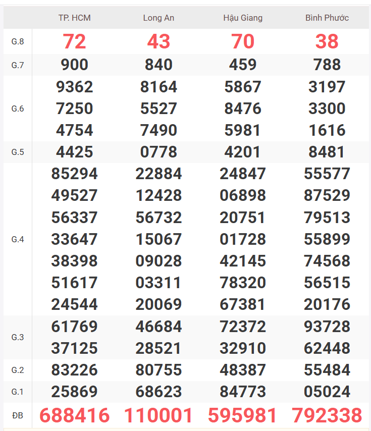 – Thứ 7 do 4 đài quay số là TP Hồ Chí Minh, Long An, Bình Phước, Hậu Giang phát hành.
