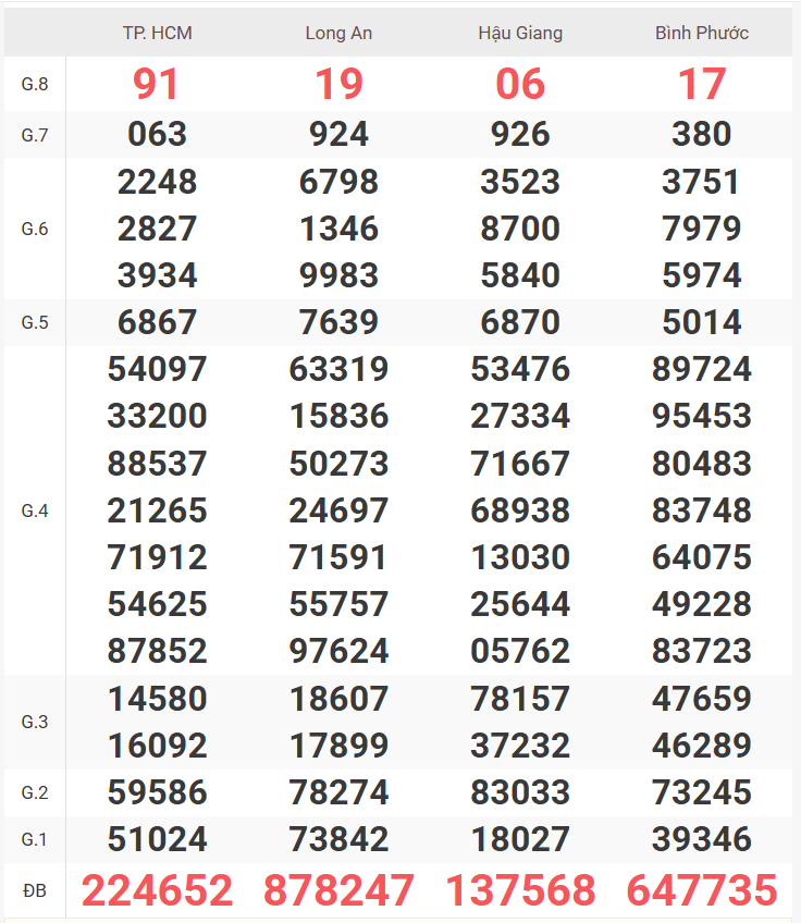 – Thứ 7 do 4 đài quay số là TP Hồ Chí Minh, Long An, Bình Phước, Hậu Giang phát hành.