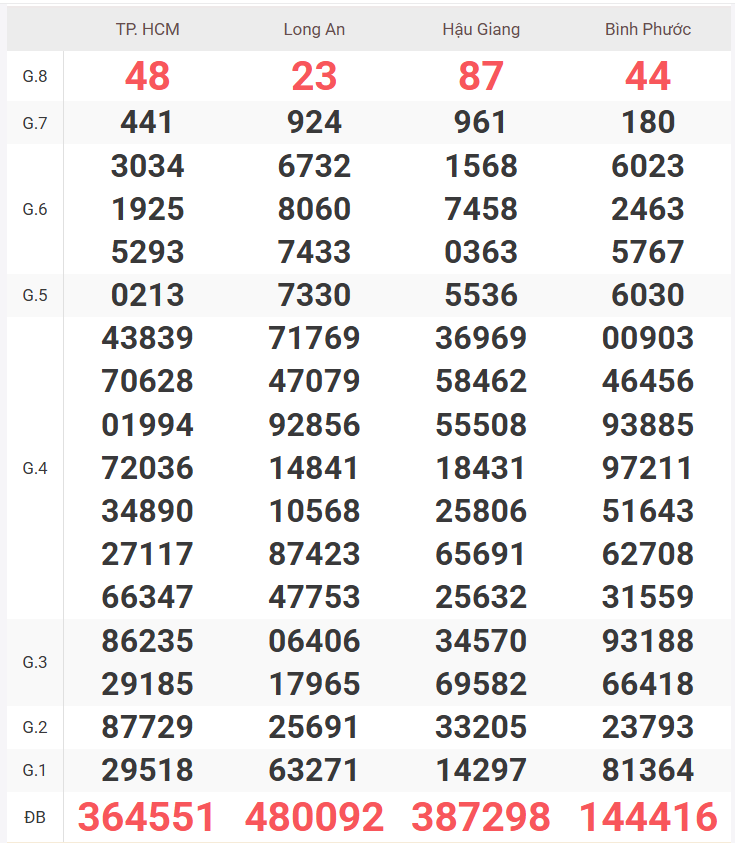 – Thứ 7 do 4 đài quay số là TP Hồ Chí Minh, Long An, Bình Phước, Hậu Giang phát hành.