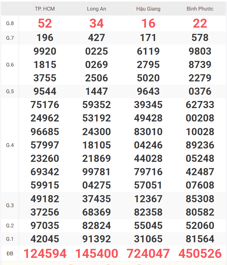 – Thứ 7 do 4 đài quay số là TP Hồ Chí Minh, Long An, Bình Phước, Hậu Giang phát hành.