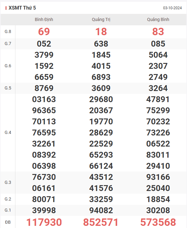 Dự đoán, soi cầu Xổ Số Miền Trung thứ 5 ngày 10/10/2024 của tỉnh Bình Định, Quảng Trị và Quảng Bình. Bật mí số có tỉ lệ về nhiều nhất trong xsmt trực tiếp hôm nay 10/10 – Chọn ra các cặp xỉu chủ đẹp, bao lô bạch thủ, song thủ lô cho xoso miền Trung ngày 10/10. Soi lô đề XSMT chính xác 100%.
