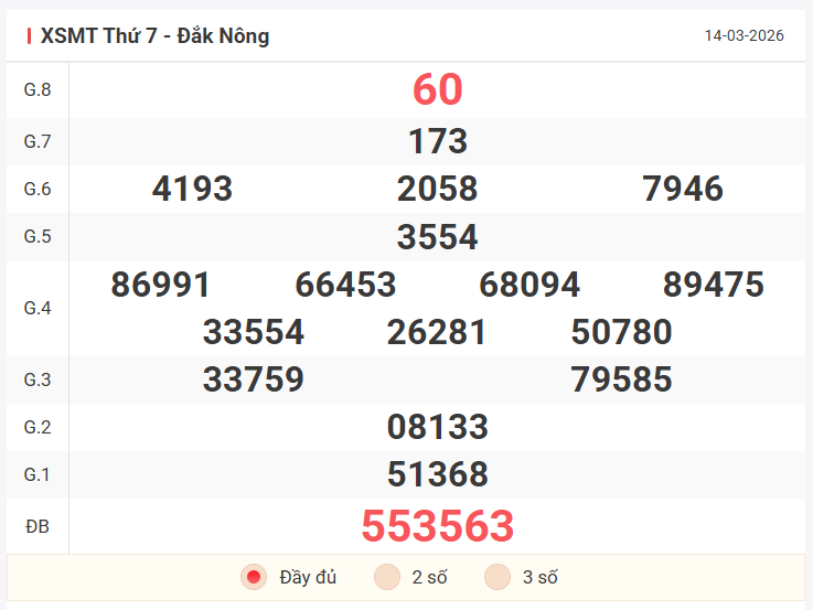 Cùng xem lại bảng kết quả XSMT kỳ trước 14/3/2026: