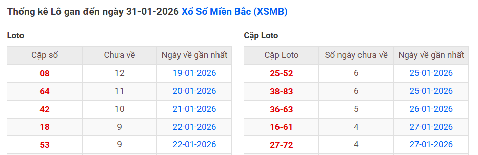 ⇒ Click vào để xem tổng hợp thông tin lô gan và cặp loto của xổ số miền Bắc tại: