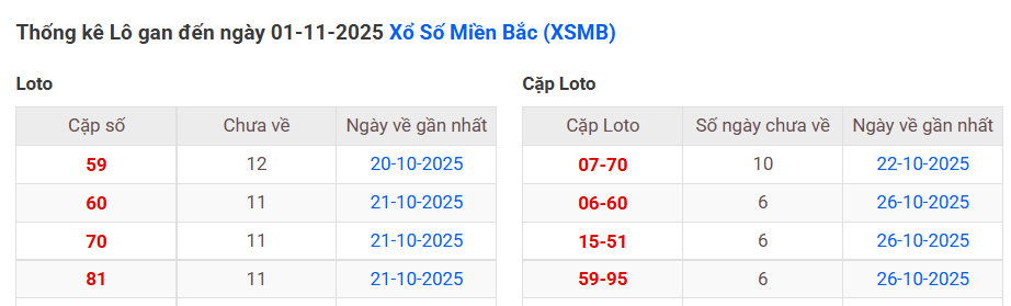 ⇒ Click vào để xem tổng hợp thông tin lô gan và cặp loto của xổ số miền Bắc tại:
