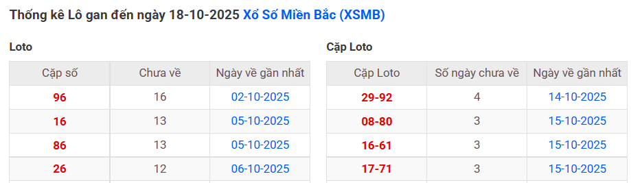 ⇒ Click vào để xem tổng hợp thông tin lô gan và cặp loto của xổ số miền Bắc tại: