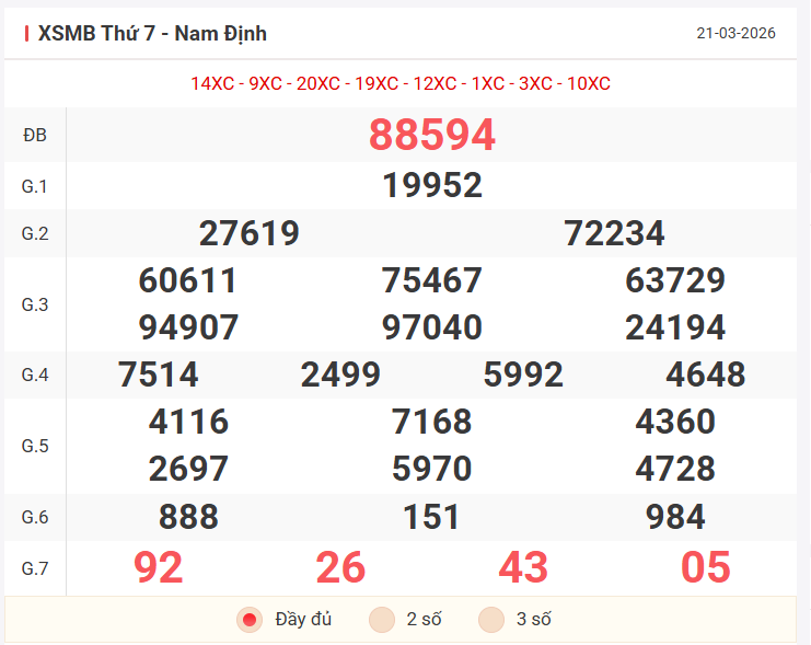 Tổng hợp kết quả xsmb hôm qua thứ 7 ngày 21/03/2026