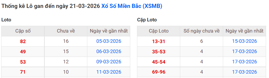 ⇒ Click vào để xem tổng hợp thông tin lô gan và cặp loto của xổ số miền Bắc tại: