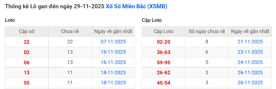 Thống kê cặp lô gan miền Bắc lâu chưa về