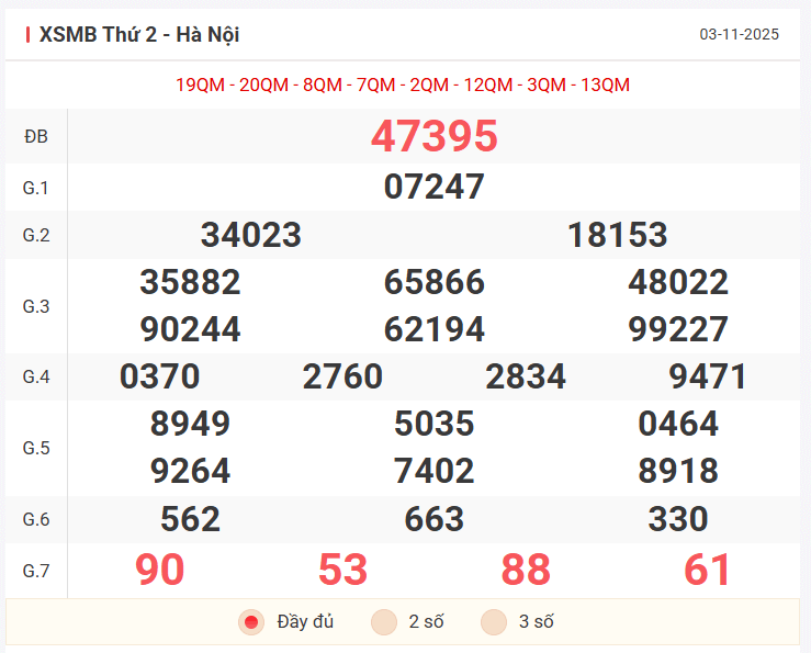 Tổng hợp kết quả xsmb hôm qua thứ 2 ngày 03/11/2025
