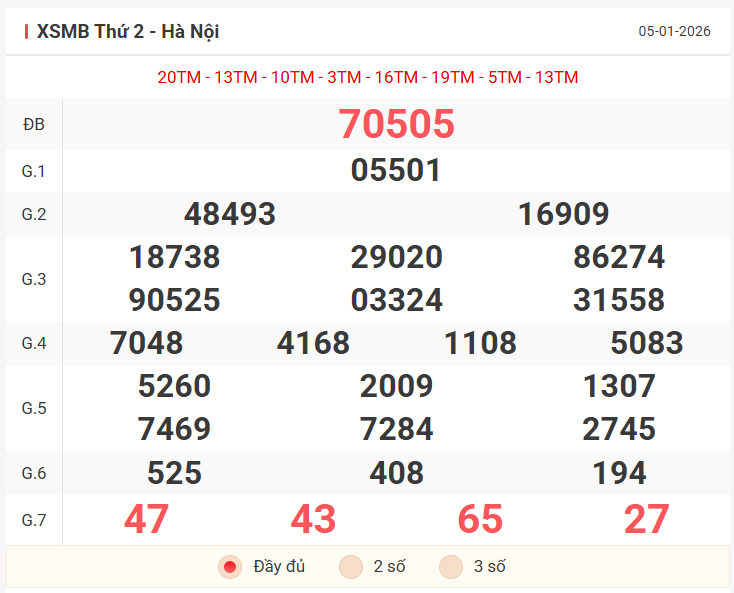 Tổng hợp kết quả xsmb hôm qua thứ 2 ngày 05/01/2026