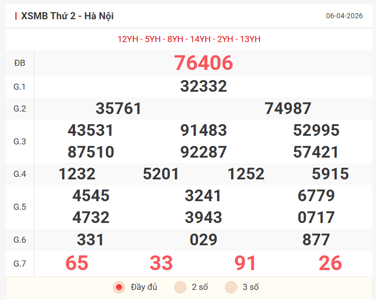 Tổng hợp kết quả xsmb hôm qua thứ 2 ngày 06/04/2026