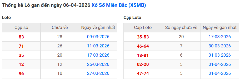⇒ Click vào để xem tổng hợp thông tin lô gan và cặp loto của xổ số miền Bắc tại: