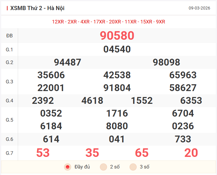 Tổng hợp kết quả xsmb hôm qua thứ 2 ngày 09/03/2026