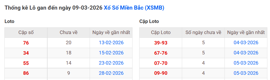 ⇒ Click vào để xem tổng hợp thông tin lô gan và cặp loto của xổ số miền Bắc tại: