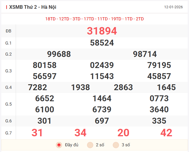 Tổng hợp kết quả xsmb hôm qua thứ 2 ngày 12/01/2026