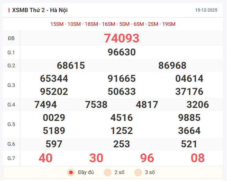 Tổng hợp kết quả xsmb hôm qua thứ 2 ngày 15/12/2025