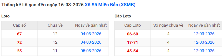 ⇒ Click vào để xem tổng hợp thông tin lô gan và cặp loto của xổ số miền Bắc tại: