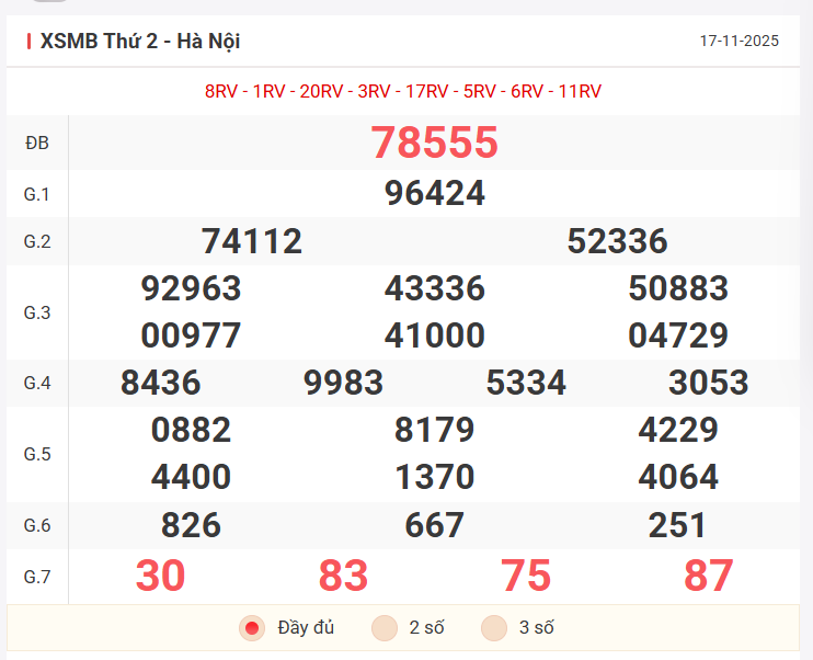 Tổng hợp kết quả xsmb hôm qua thứ 2 ngày 17/11/2025