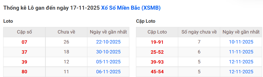 ⇒ Click vào để xem tổng hợp thông tin lô gan và cặp loto của xổ số miền Bắc tại: