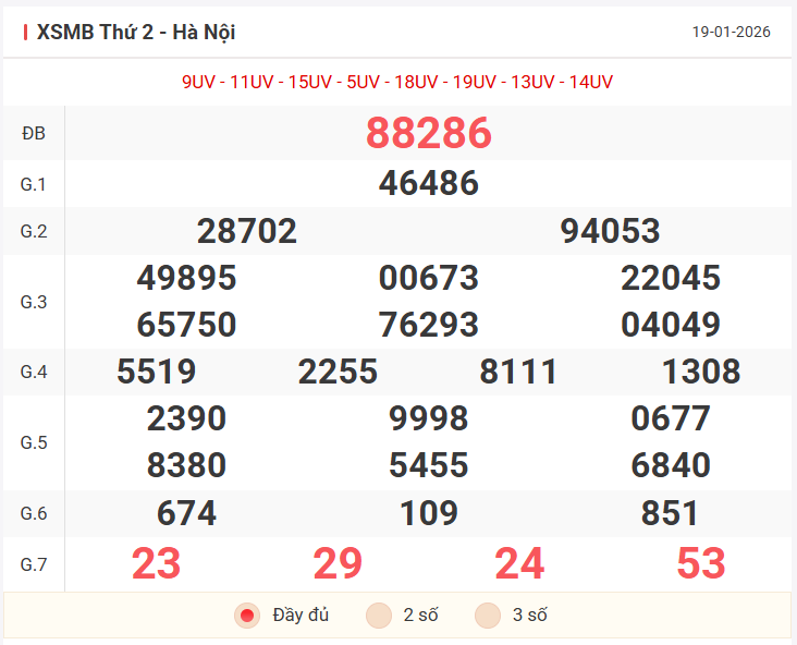 Tổng hợp kết quả xsmb hôm qua thứ 2 ngày 19/01/2026