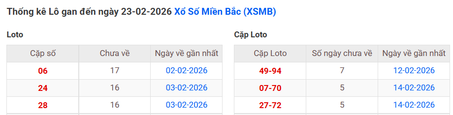 ⇒ Click vào để xem tổng hợp thông tin lô gan và cặp loto của xổ số miền Bắc tại: