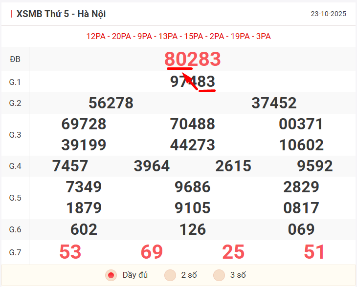 Kết quả giải đặc biệt 80283, ghép chạm thẳng – bóng 3 số đầu được dàn đề rút gọn như sau: