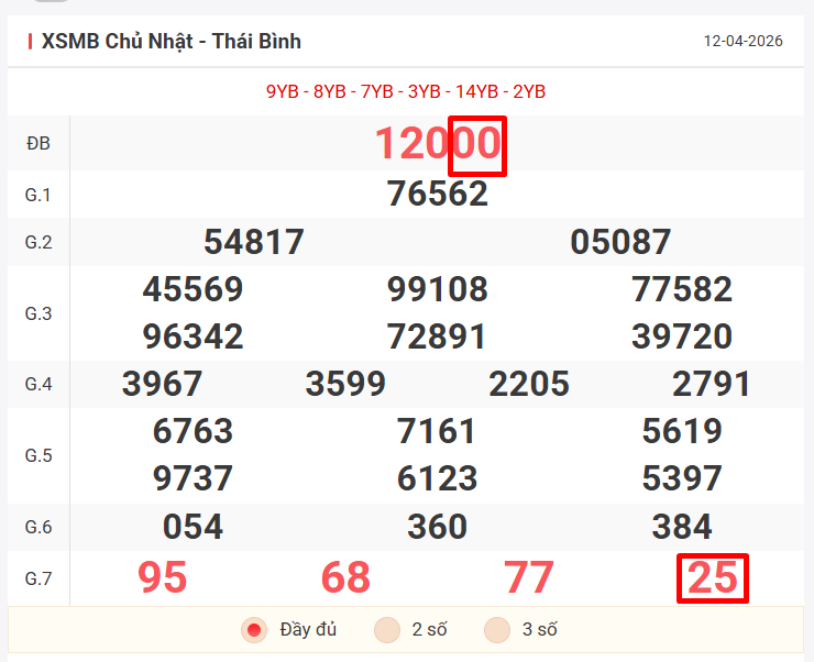 Kết quả giải đặc biệt 12000, ghép chạm thẳng – bóng 3 số đầu được dàn đề rút gọn như sau: