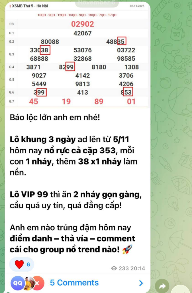 📅Ngày 6/11: Lô khung 2 ngày (lên cầu ngày 5/11) nổ rực rỡ cặp 353, mỗi con 1 nháy; 38 về 1 nháy; lô kép 44-99 về được 99 2 nháy