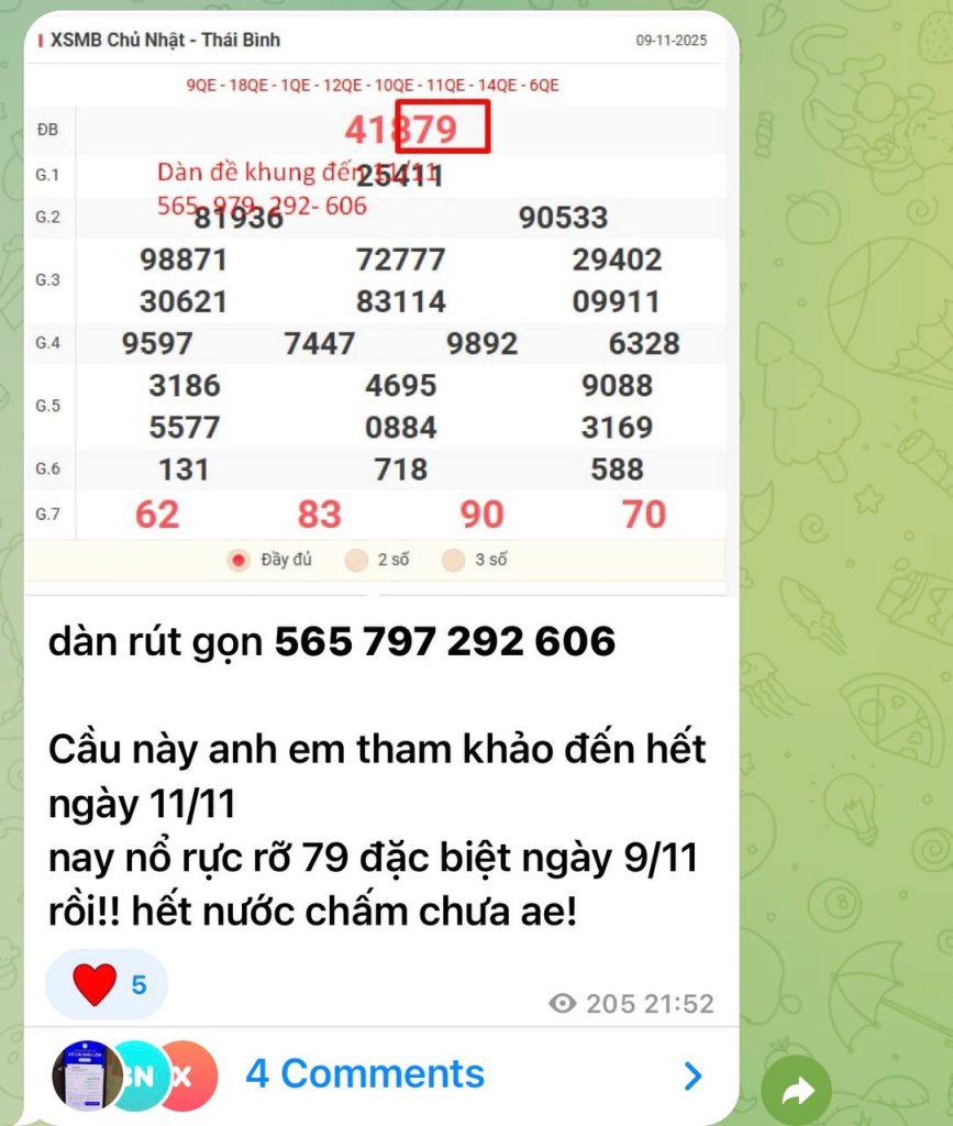 Thần Mèo đã lên dàn đề khung cho anh em vào ngày 5/11 với cặp dàn đề: 565 797 292 606, kết quả trả về ngày 9/11 nổ 79 đặc biệt!