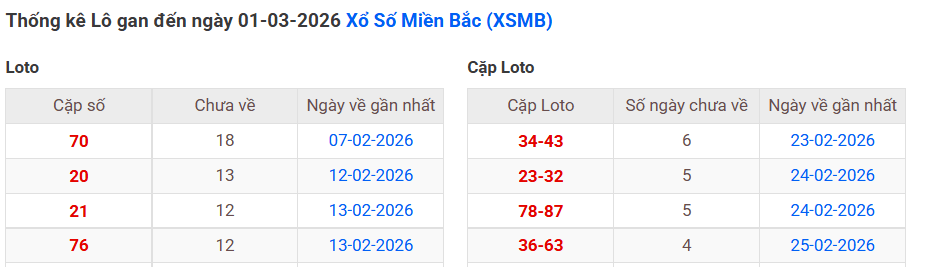 ⇒ Click vào để xem tổng hợp thông tin lô gan và cặp loto của xổ số miền Bắc tại: