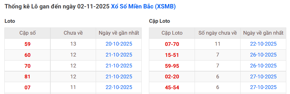 ⇒ Click vào để xem tổng hợp thông tin lô gan và cặp loto của xổ số miền Bắc tại: