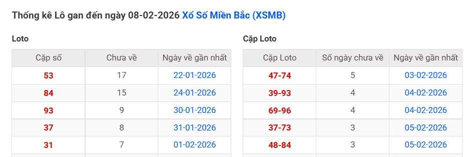 ⇒ Click vào để xem tổng hợp thông tin lô gan và cặp loto của xổ số miền Bắc tại: