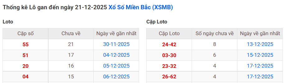 ⇒ Click vào để xem tổng hợp thông tin lô gan và cặp loto của xổ số miền Bắc tại: