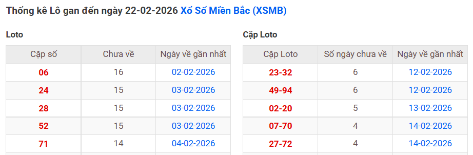 ⇒ Click vào để xem tổng hợp thông tin lô gan và cặp loto của xổ số miền Bắc tại: