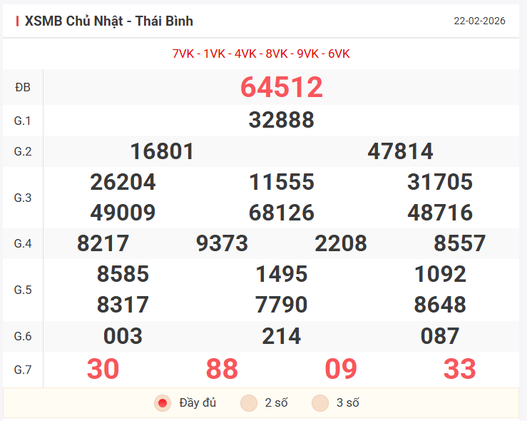 Tổng hợp kết quả xsmb hôm qua Chủ Nhật ngày 22/02/2026