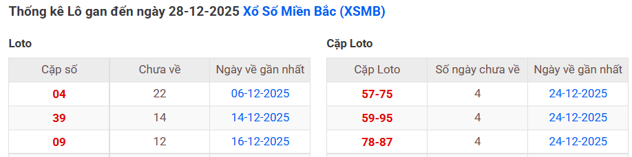 ⇒ Click vào để xem tổng hợp thông tin lô gan và cặp loto của xổ số miền Bắc tại: