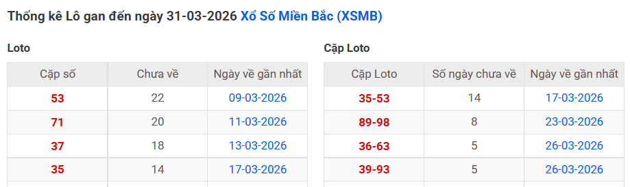 ⇒ Click vào để xem tổng hợp thông tin lô gan và cặp loto của xổ số miền Bắc tại: