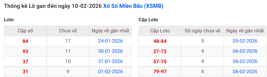 ⇒ Click vào để xem tổng hợp thông tin lô gan và cặp loto của xổ số miền Bắc tại: