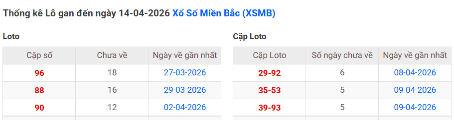 ⇒ Click vào để xem tổng hợp thông tin lô gan và cặp loto của xổ số miền Bắc tại: