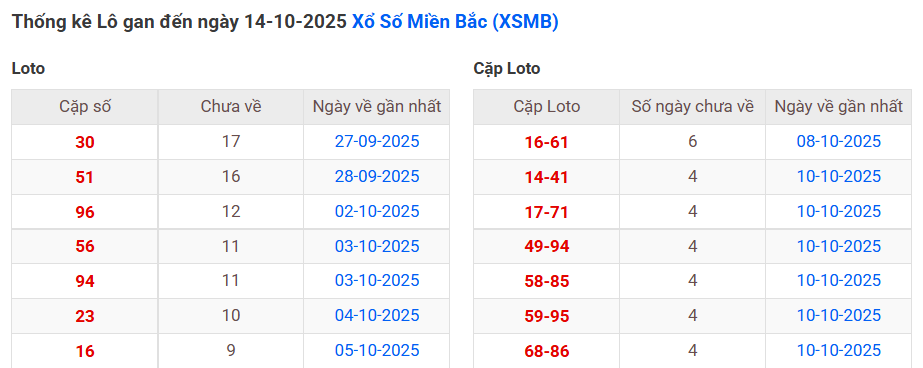 ⇒ Click vào để xem tổng hợp thông tin lô gan và cặp loto của xổ số miền Bắc tại: