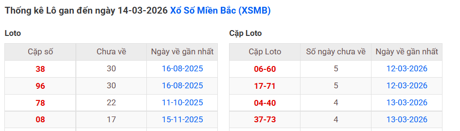 ⇒ Click vào để xem tổng hợp thông tin lô gan và cặp loto của xổ số miền Bắc tại: