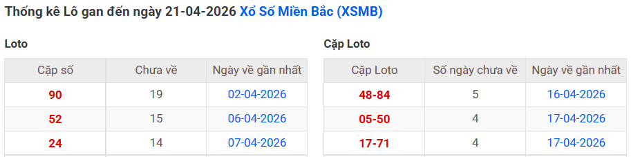 ⇒ Click vào để xem tổng hợp thông tin lô gan và cặp loto của xổ số miền Bắc tại: