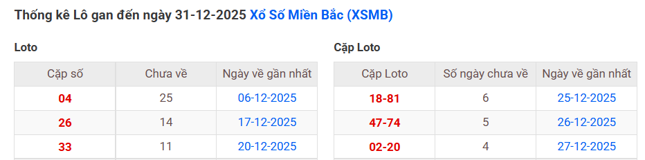 ⇒ Click vào để xem tổng hợp thông tin lô gan và cặp loto của xổ số miền Bắc tại: