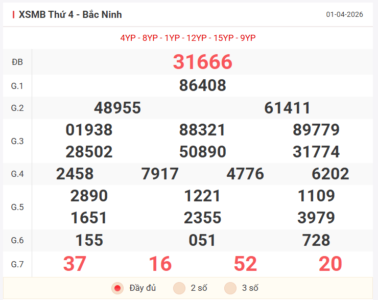 Tổng hợp kết quả xsmb hôm qua thứ 4 ngày 01/04/2026