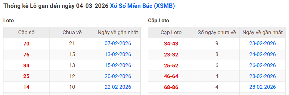 ⇒ Click vào để xem tổng hợp thông tin lô gan và cặp loto của xổ số miền Bắc tại: